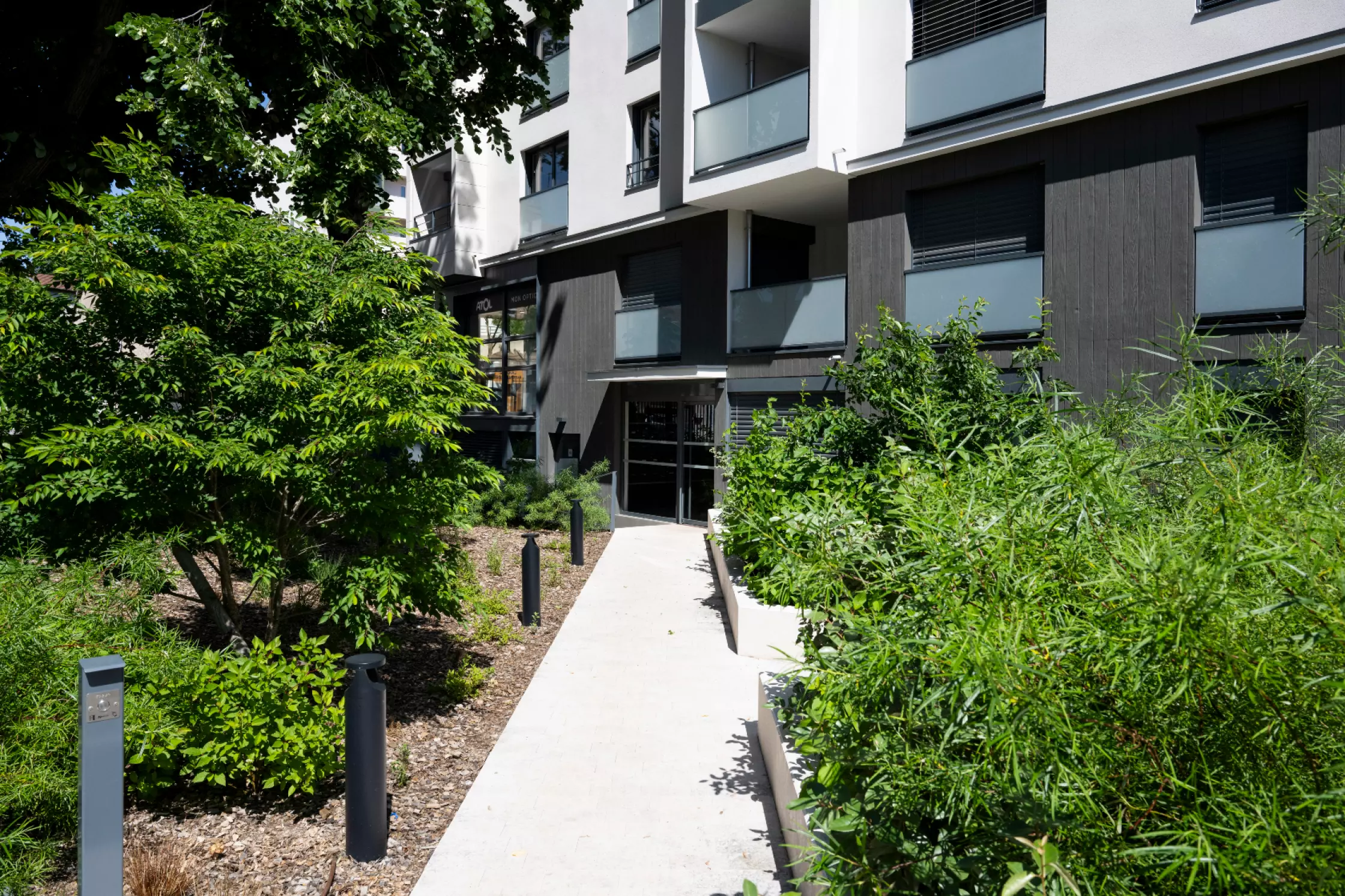 De part et d'autre de l'immeuble se trouvent deux espaces verts : celui situé à l'Ouest est aussi le cheminement piéton d'entrée dans la résidence. Des arbres centenaires, présents sur la parcelle, ont été conservés et offrent à l'immeuble un vrai cadre de verdure.
